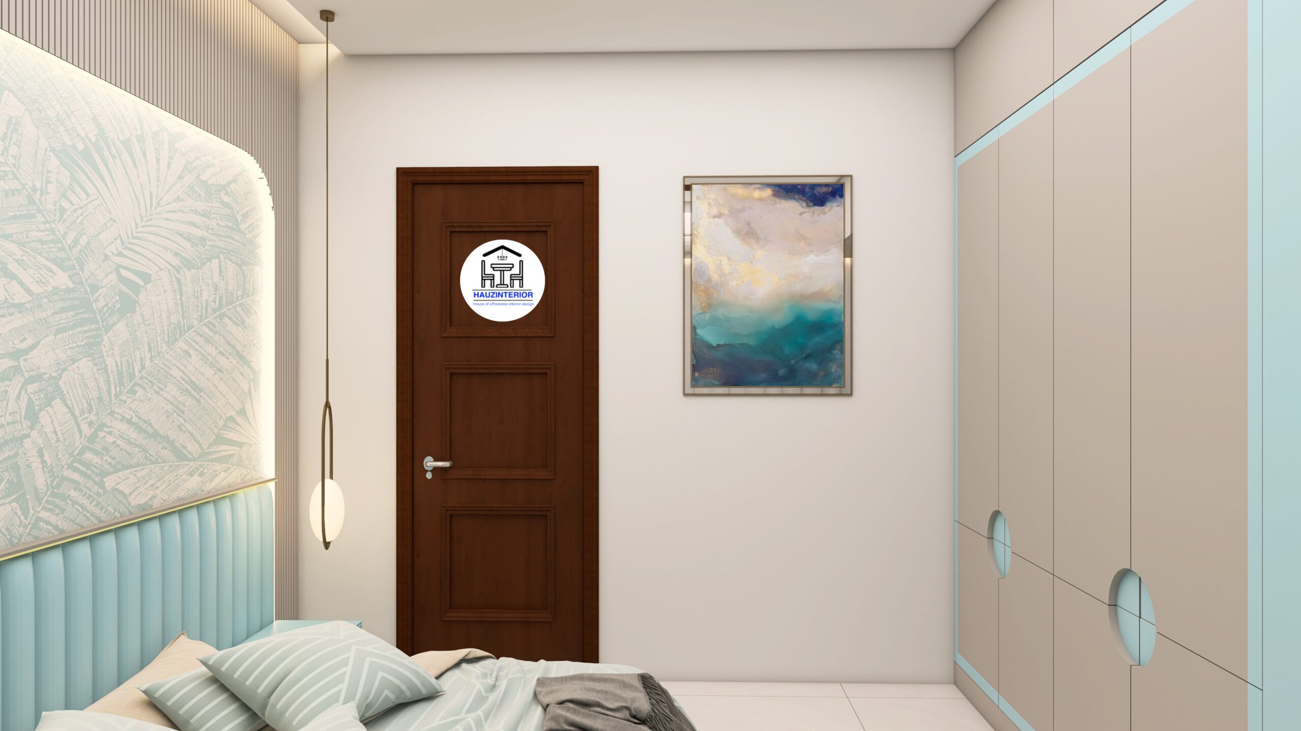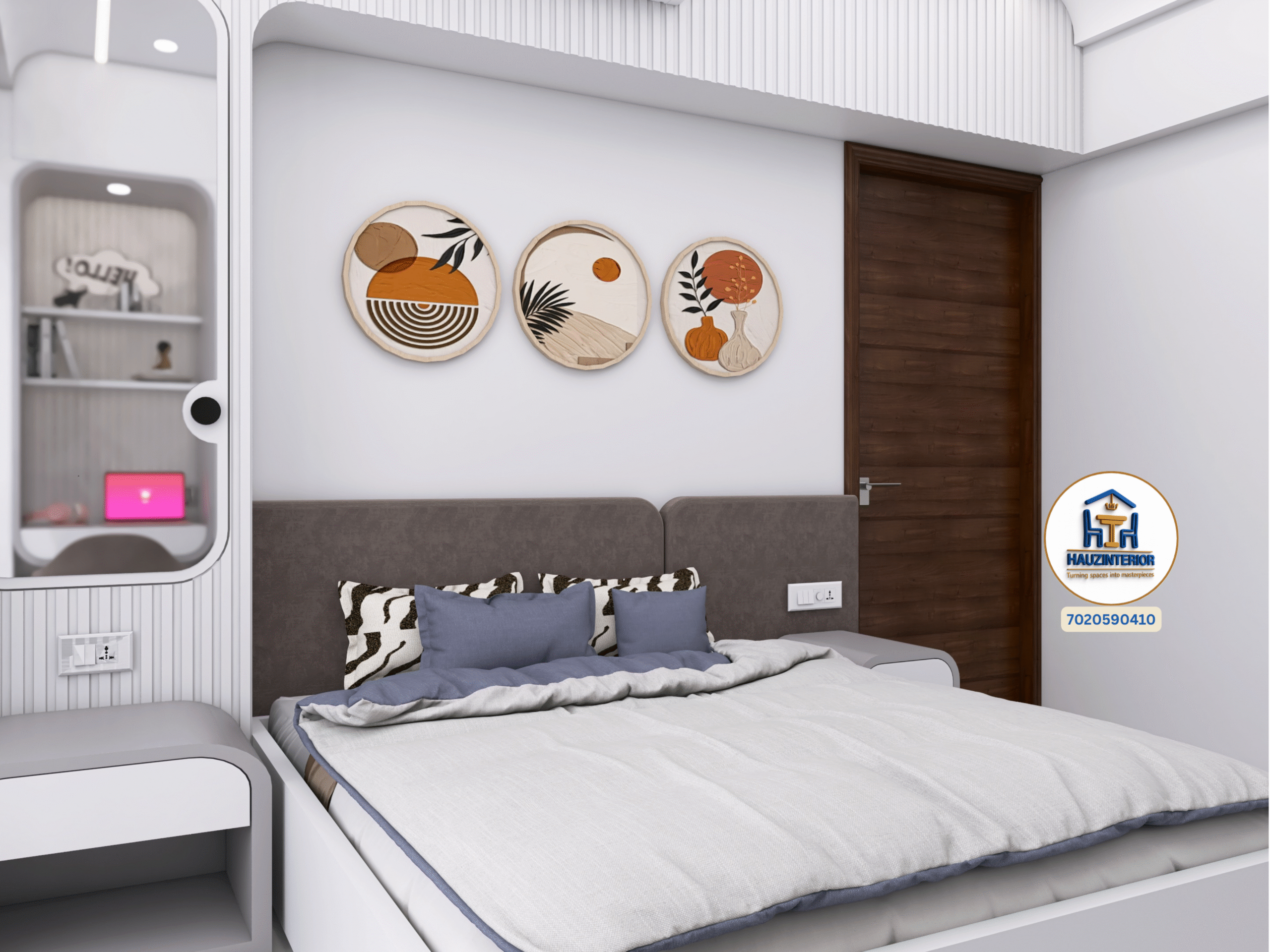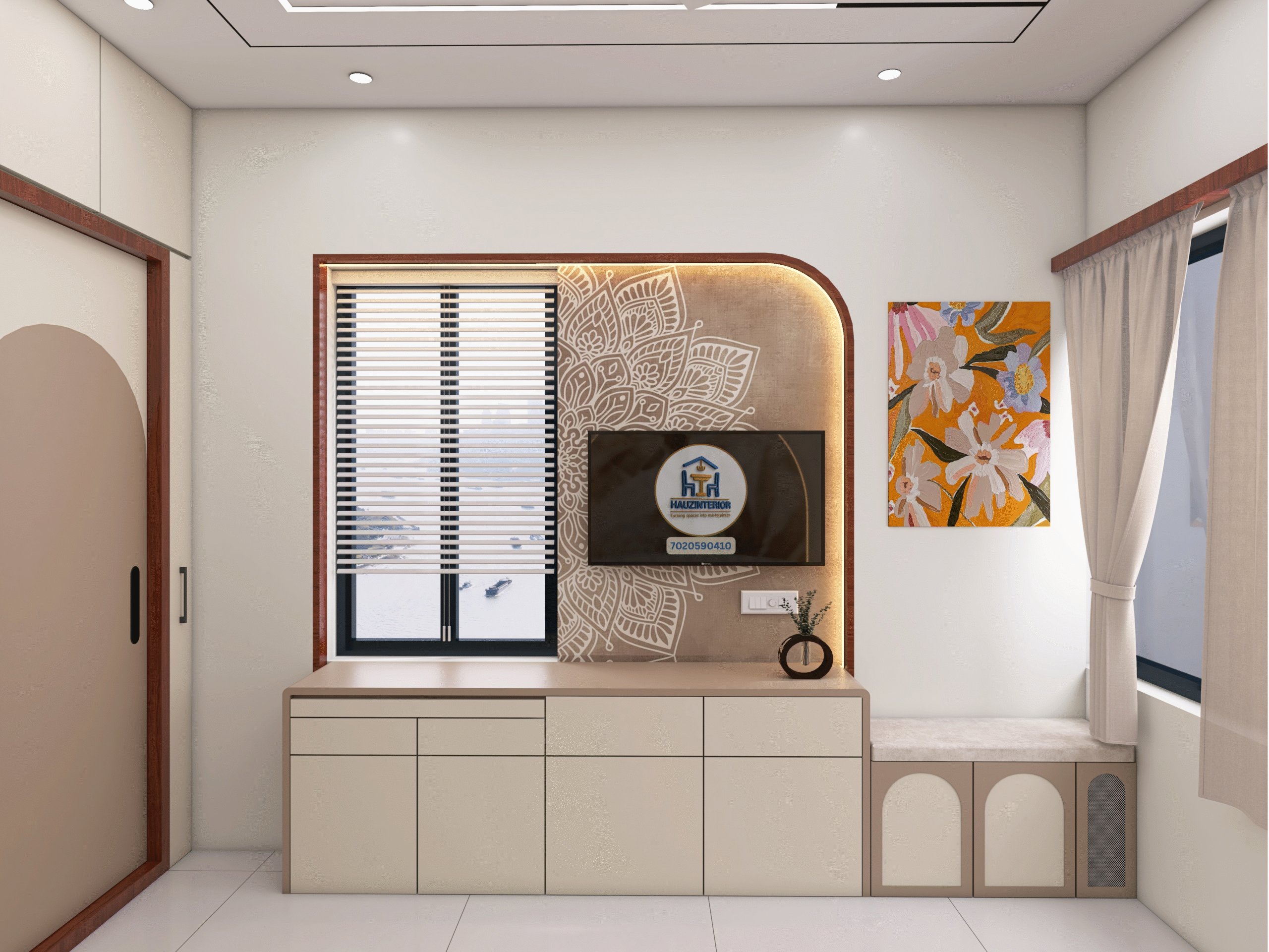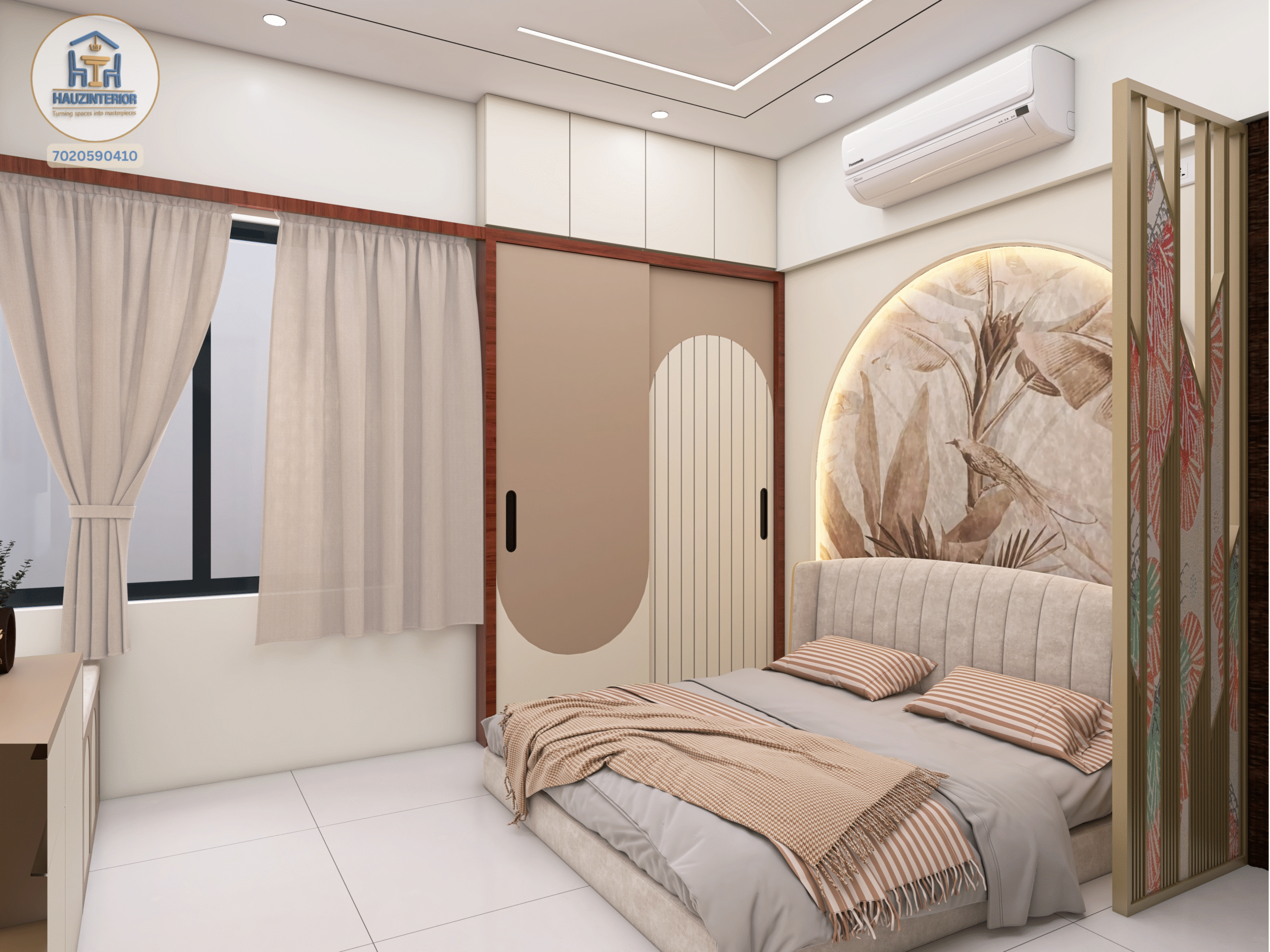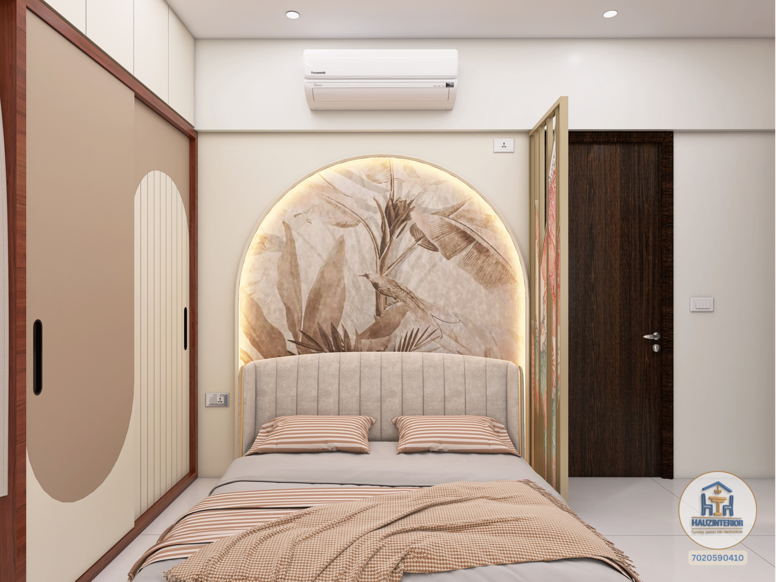 This tranquil bedroom by Hauz Interior showcases a calming earthy palette, arched wall art with ambient backlighting, sleek modular wardrobes, and elegant mandala detailing—offering a perfect blend of style and serenity. Watch full project via 3D Walkthrough link.