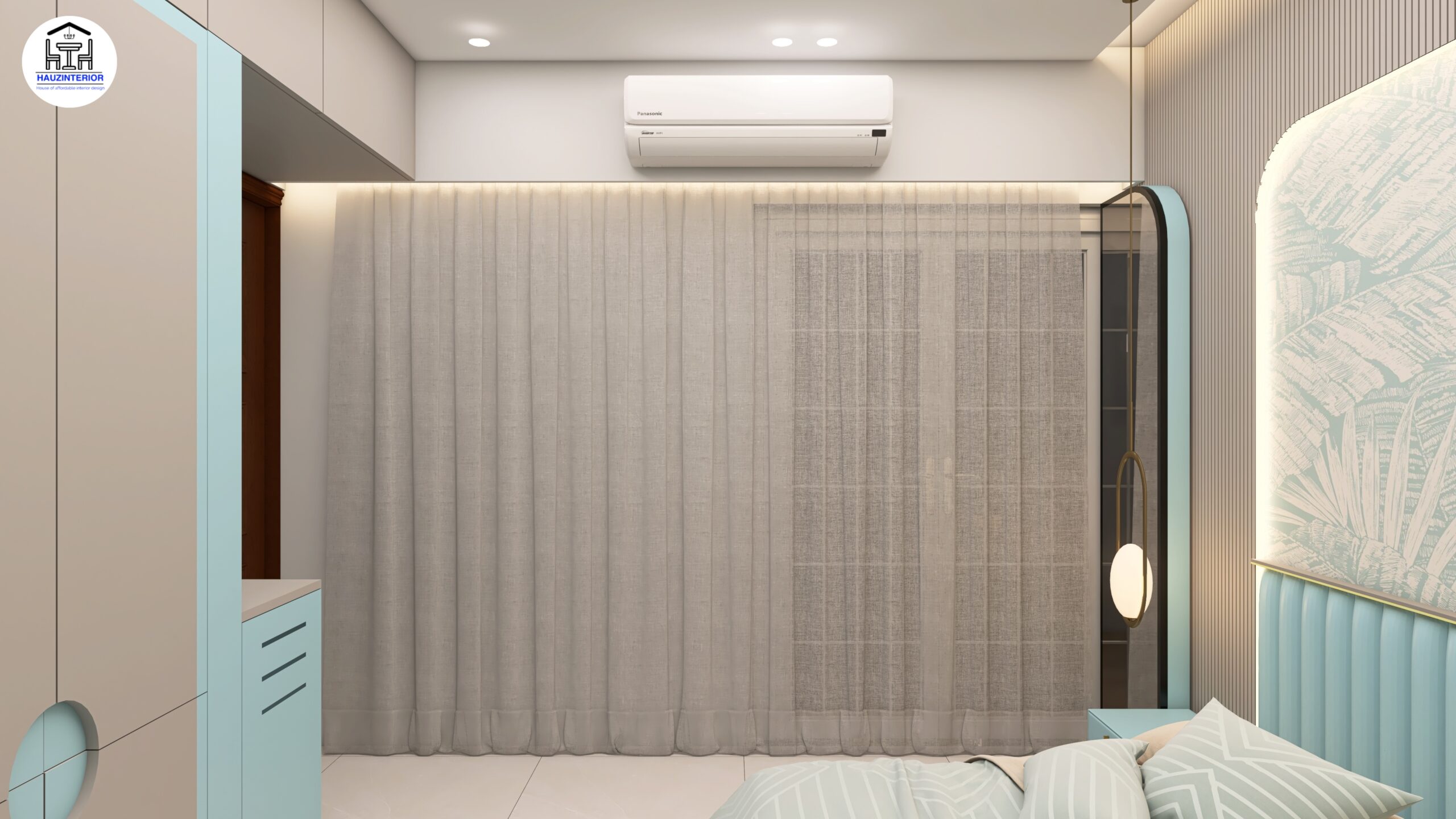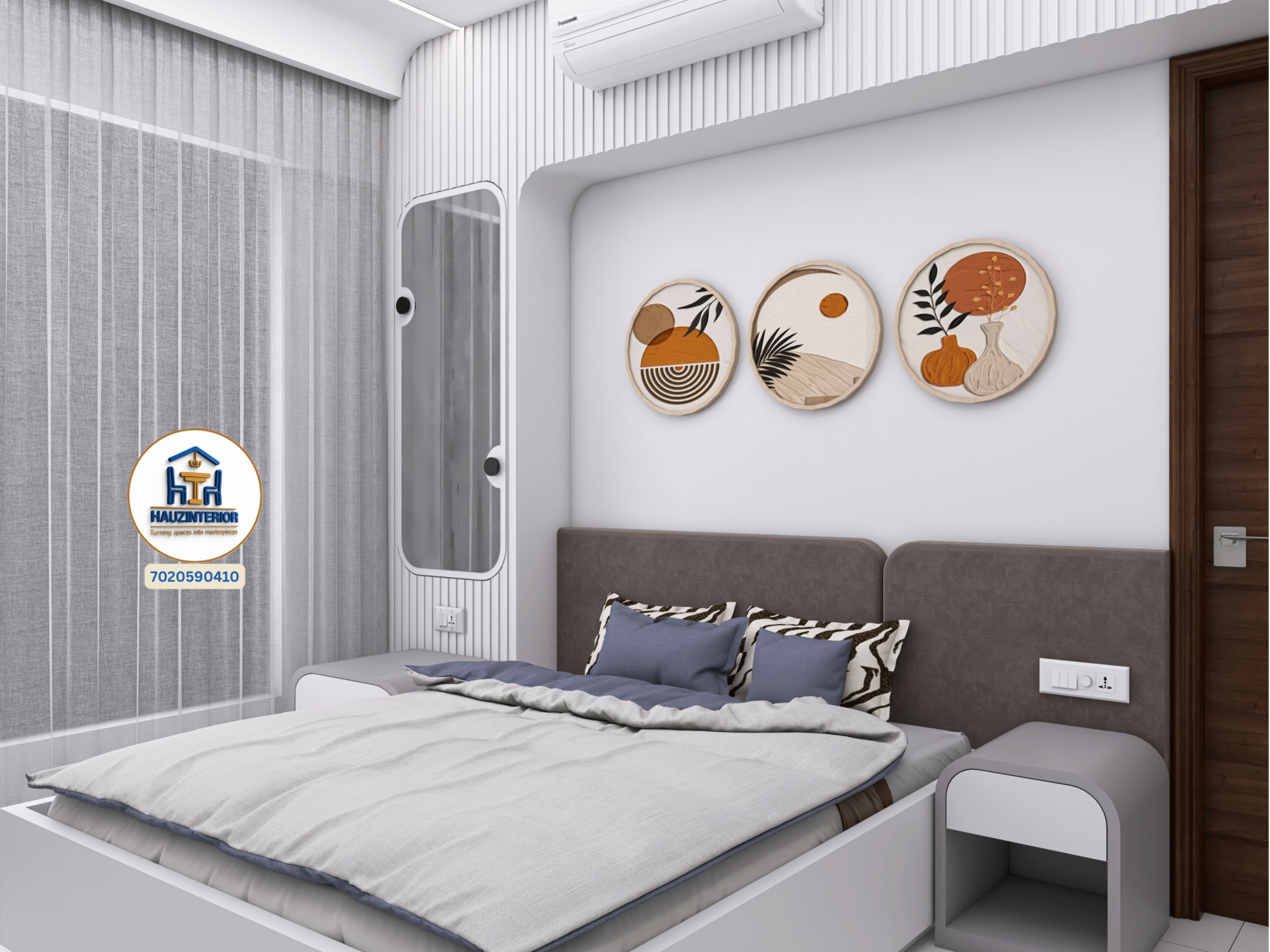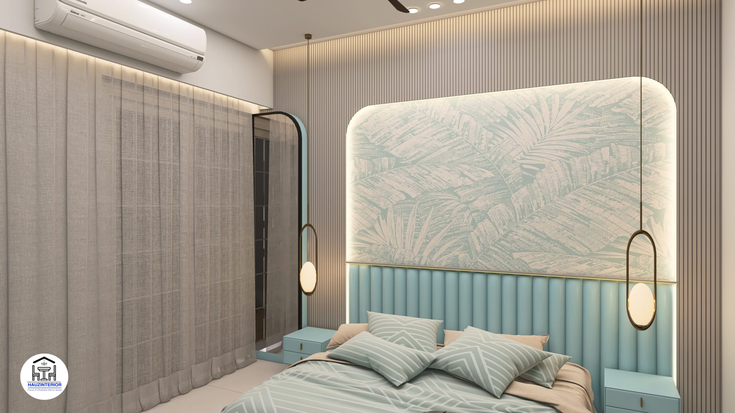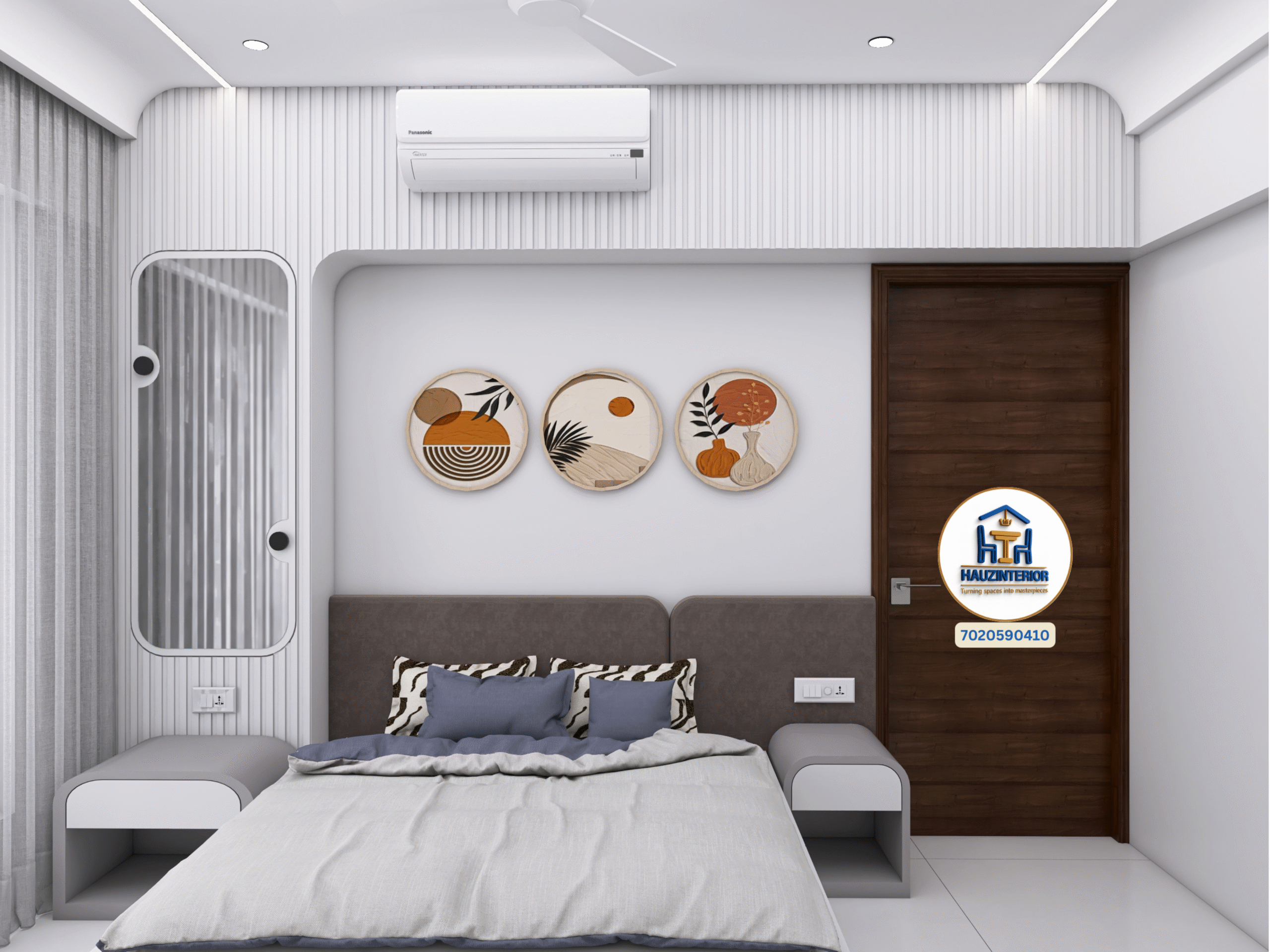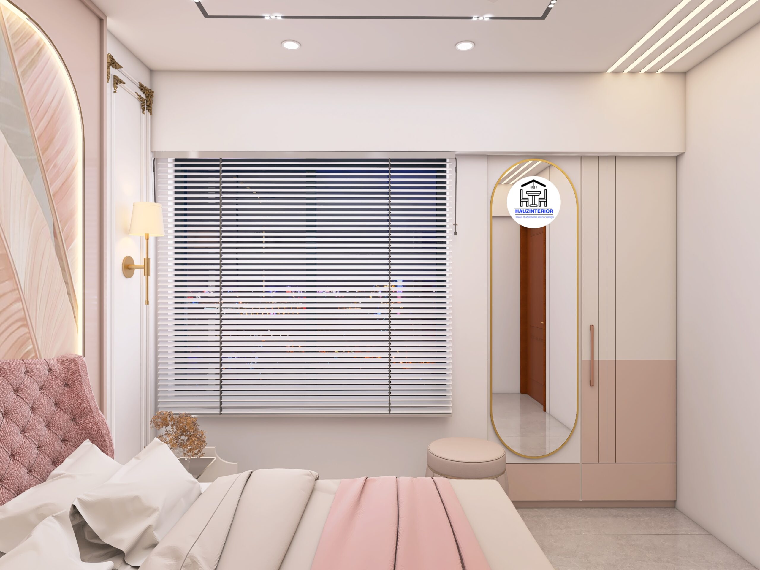This tranquil bedroom by Hauz Interior showcases a calming earthy palette, arched wall art with ambient backlighting, sleek modular wardrobes, and elegant mandala detailing—offering a perfect blend of style and serenity. Watch full project via 3D Walkthrough link.