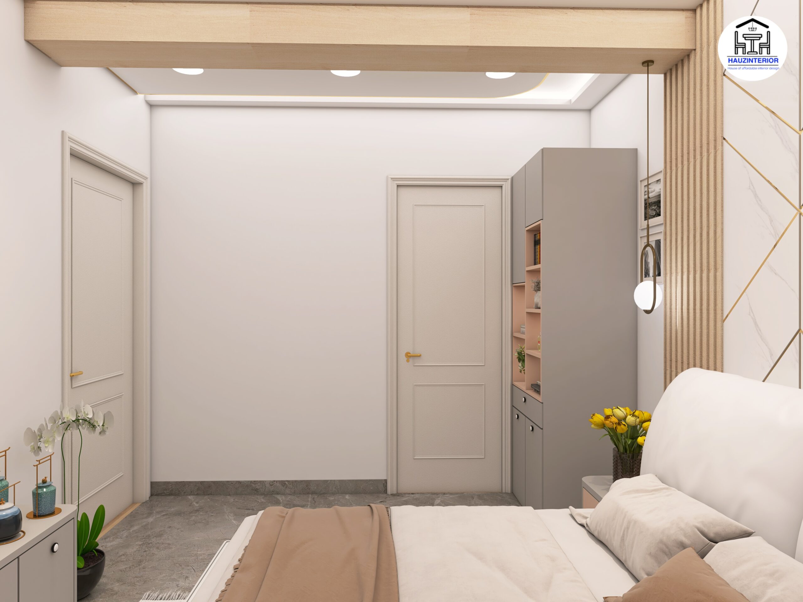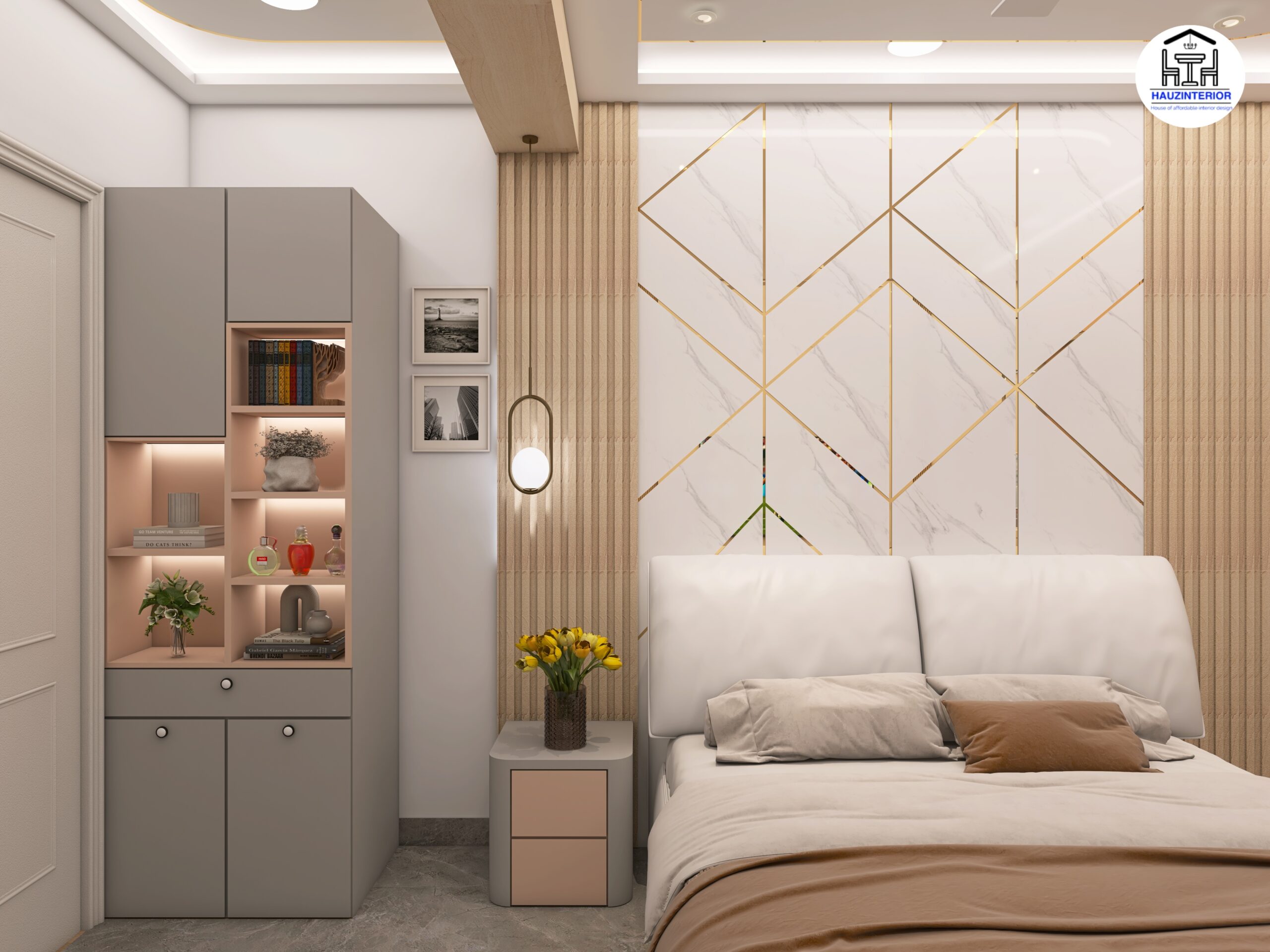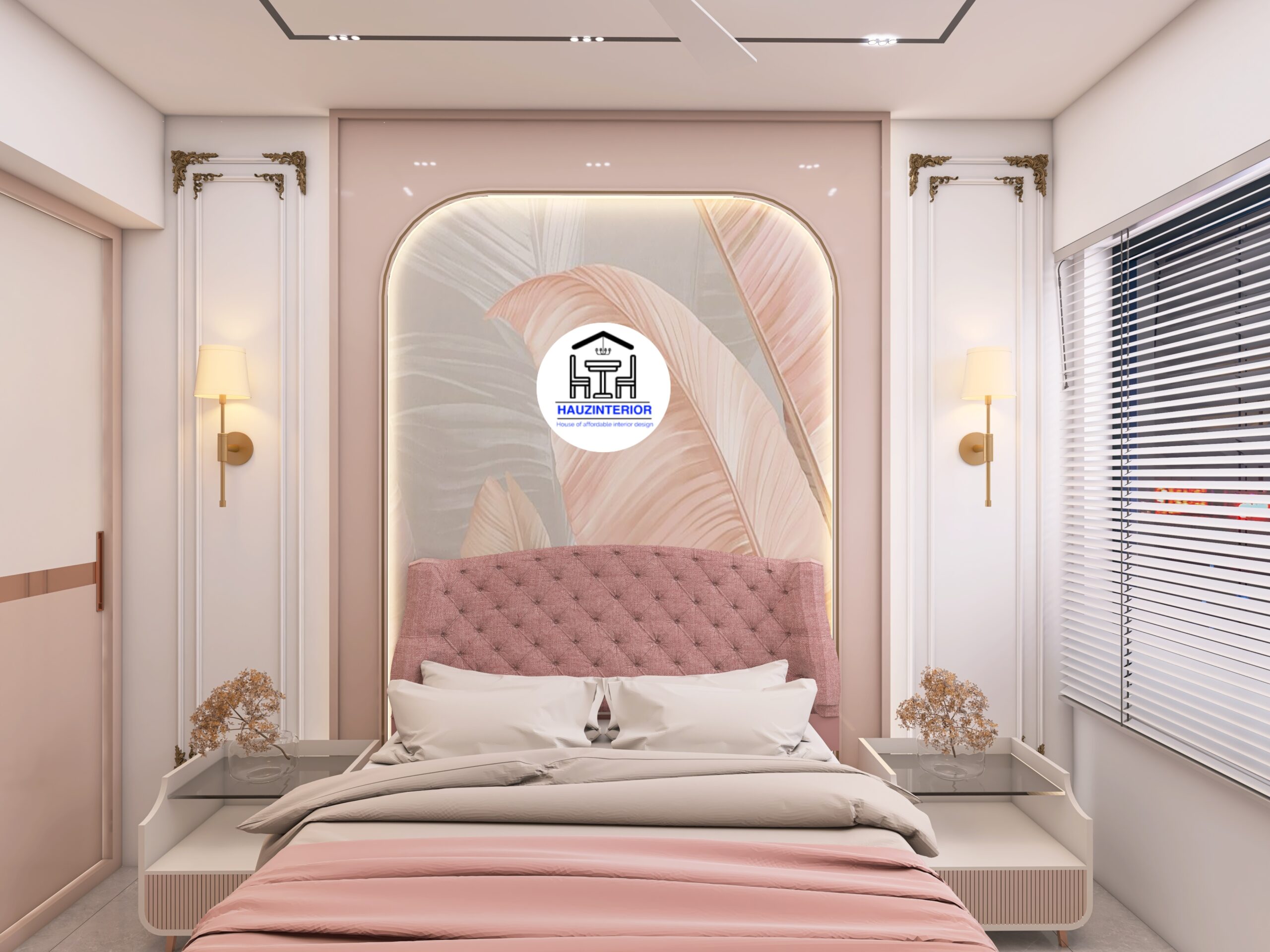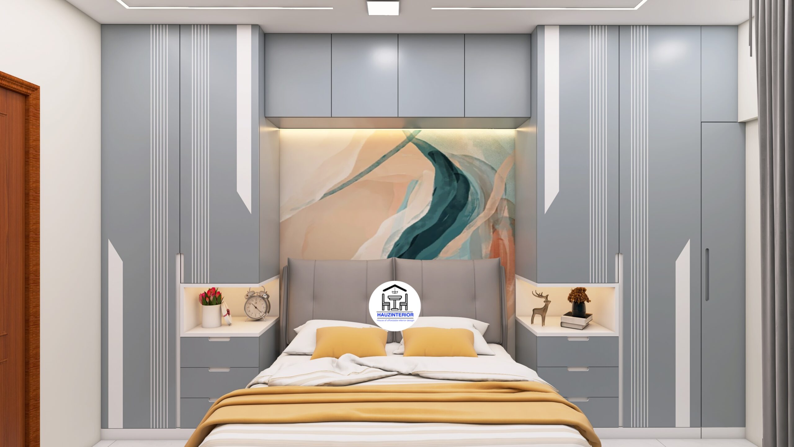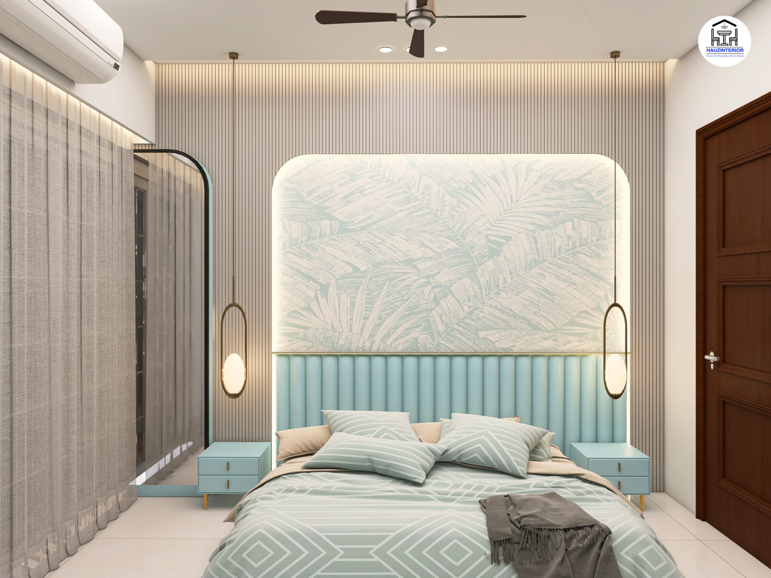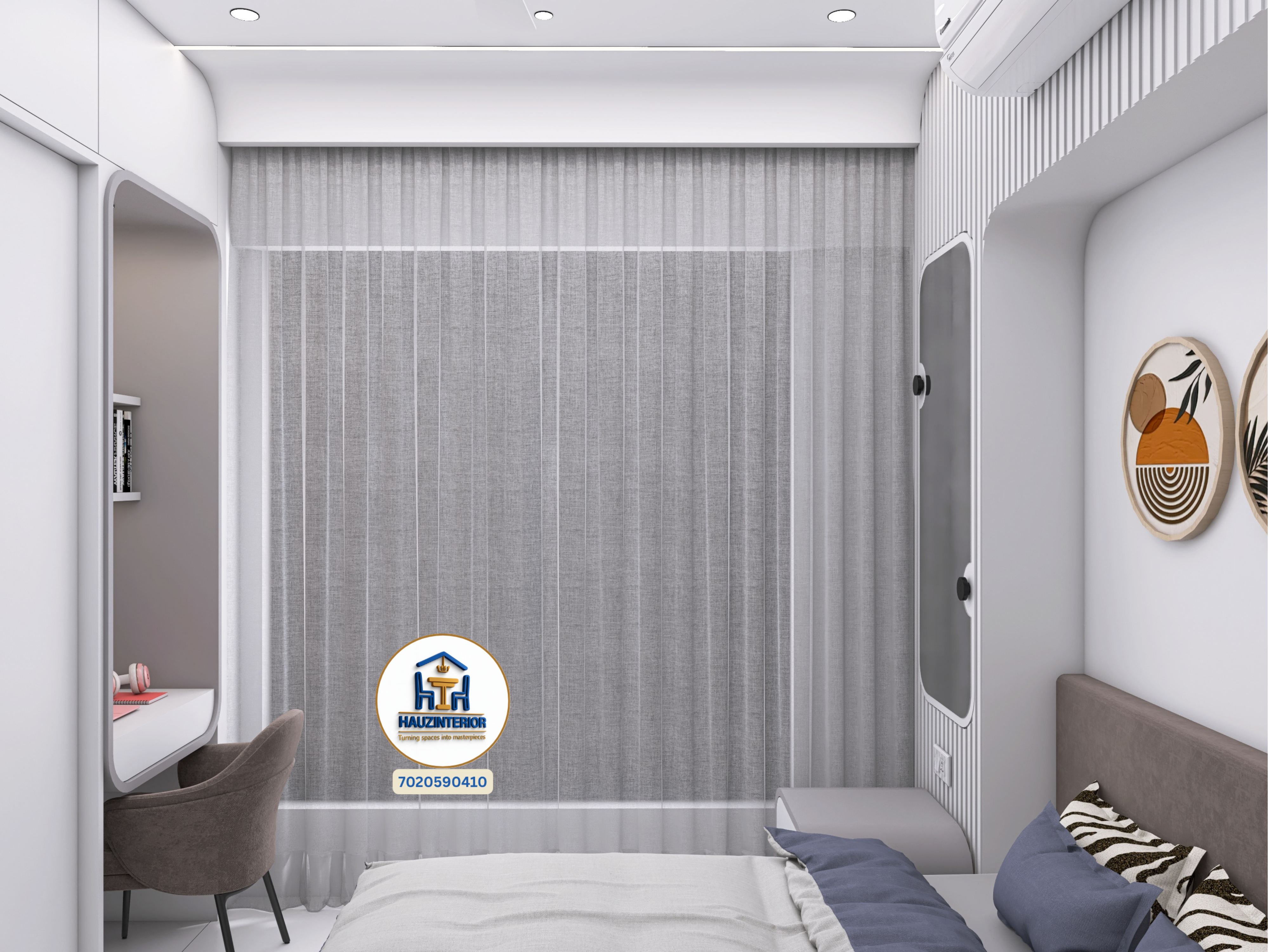 This tranquil bedroom by Hauz Interior showcases a calming earthy palette, arched wall art with ambient backlighting, sleek modular wardrobes, and elegant mandala detailing—offering a perfect blend of style and serenity. Watch full project via 3D Walkthrough link.