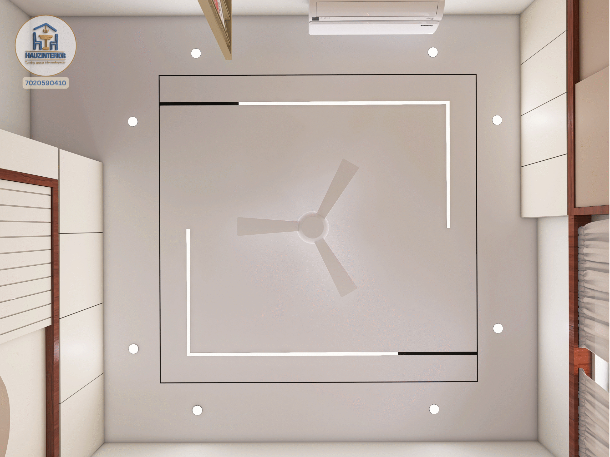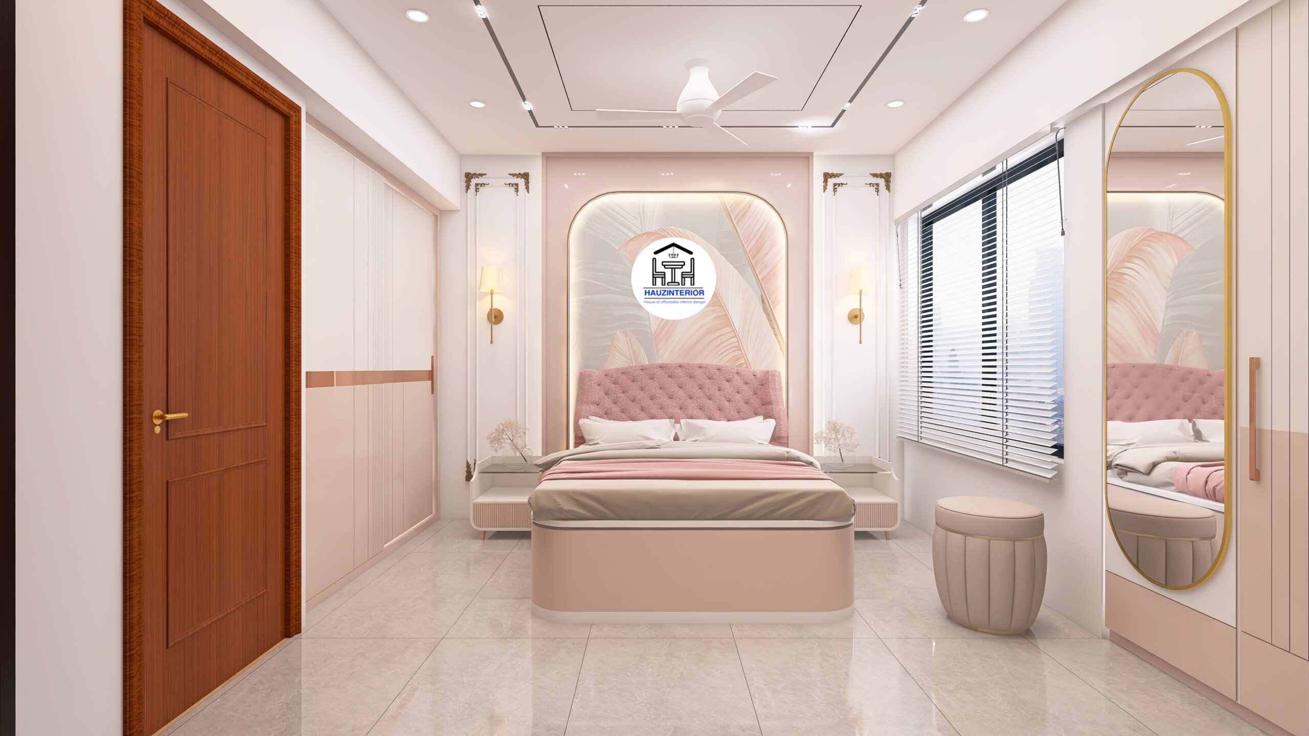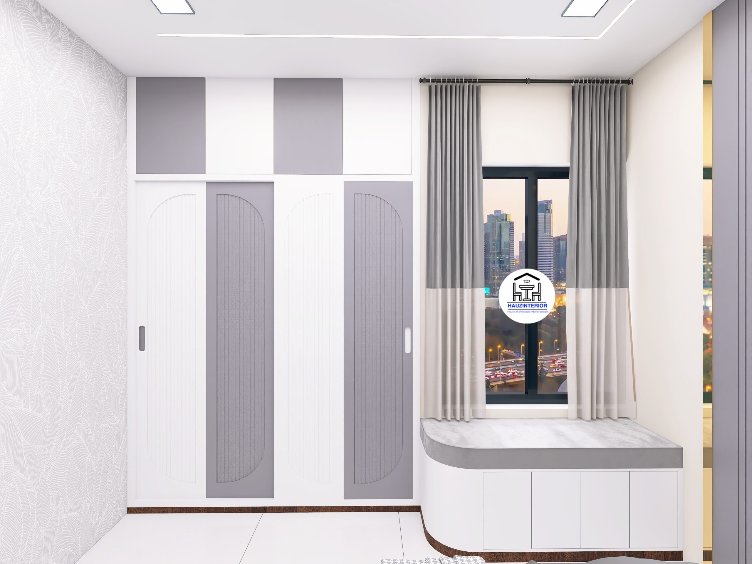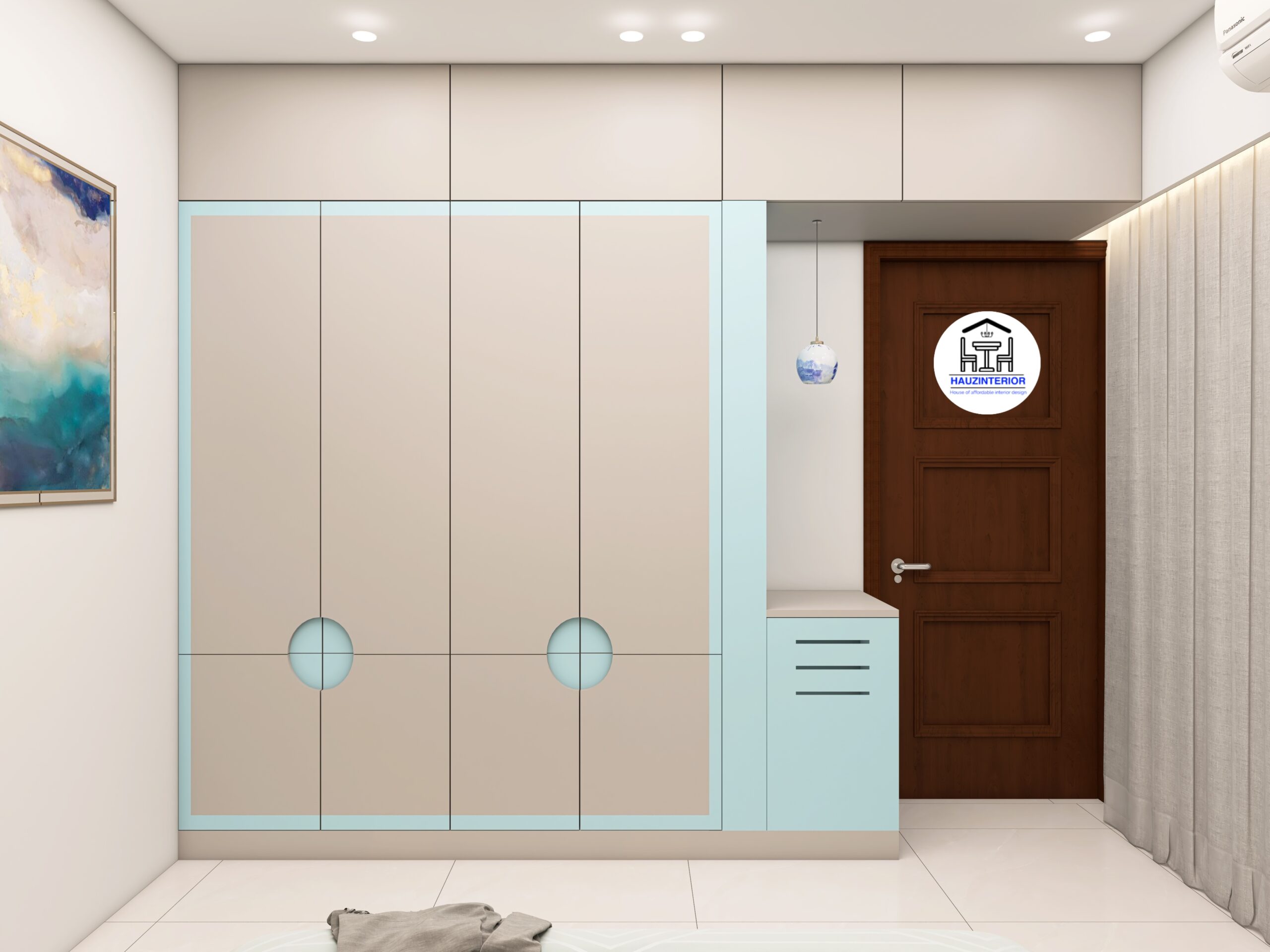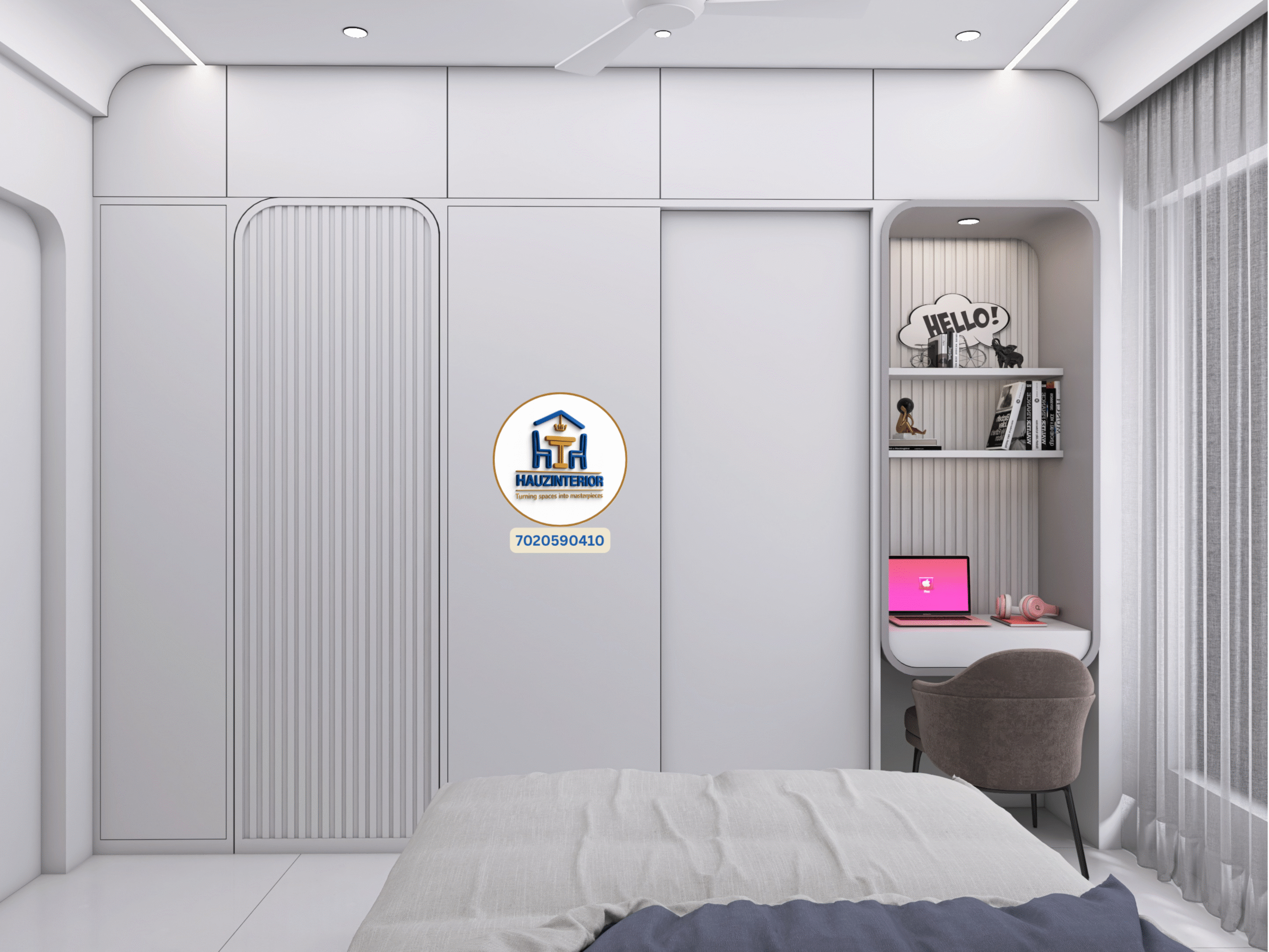 This tranquil bedroom by Hauz Interior showcases a calming earthy palette, arched wall art with ambient backlighting, sleek modular wardrobes, and elegant mandala detailing—offering a perfect blend of style and serenity. Watch full project via 3D Walkthrough link.