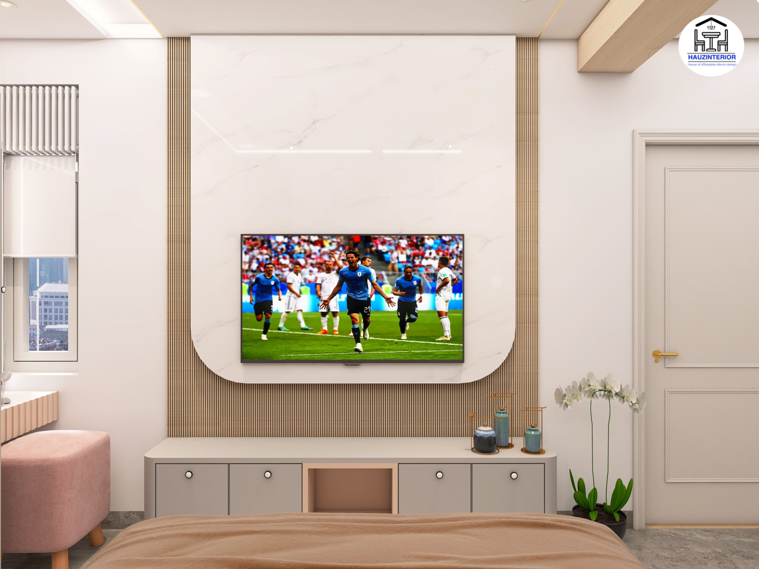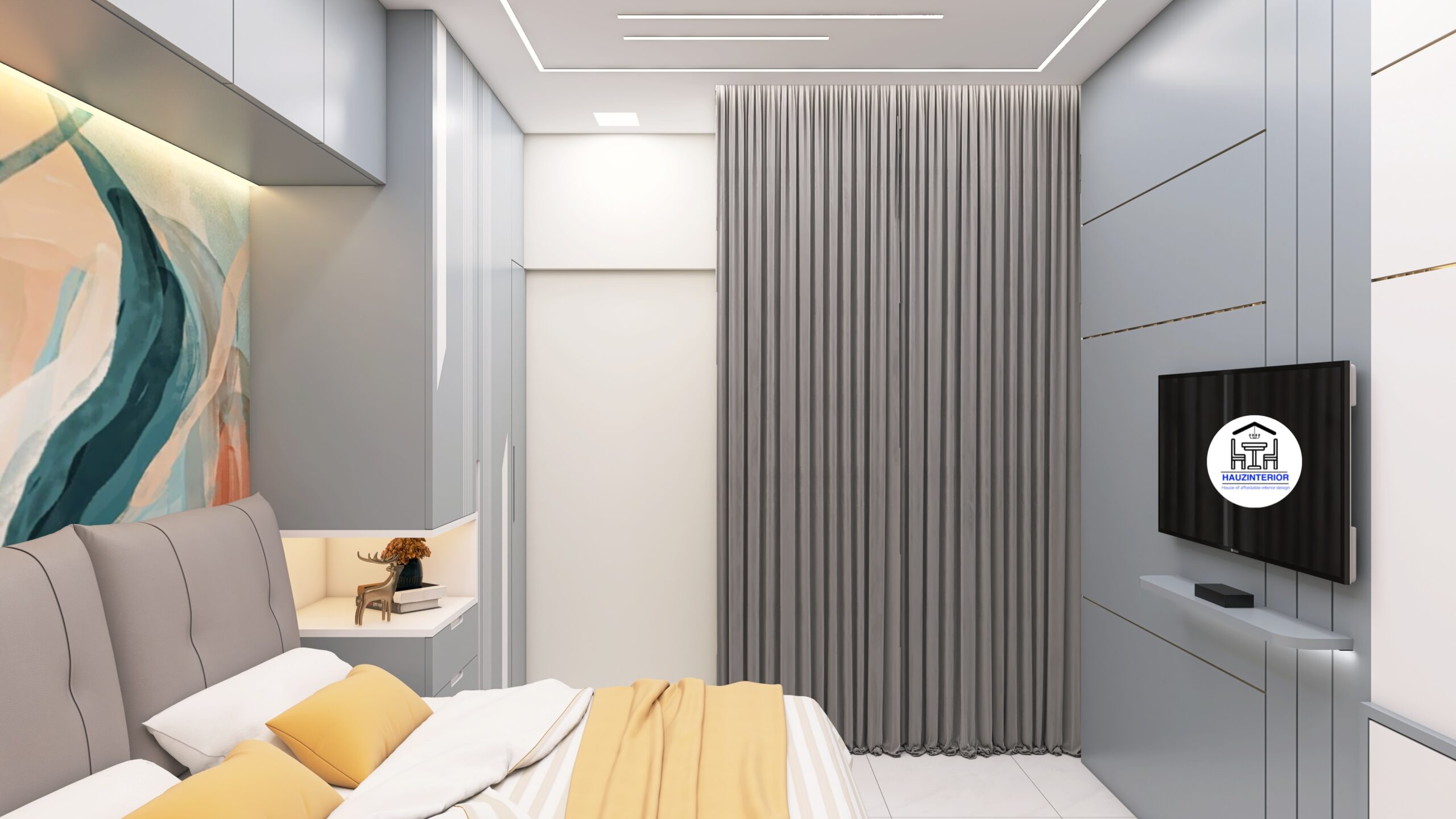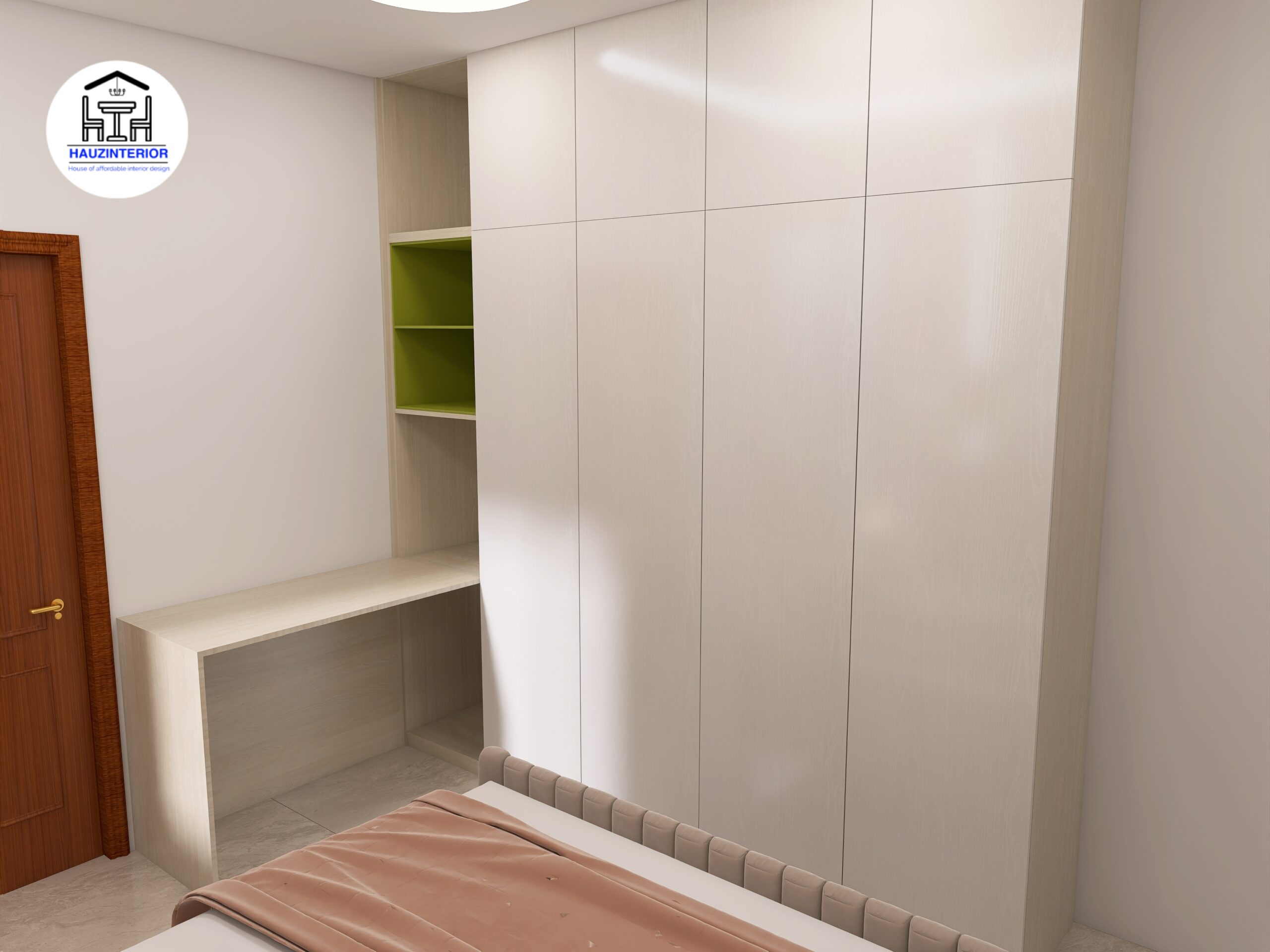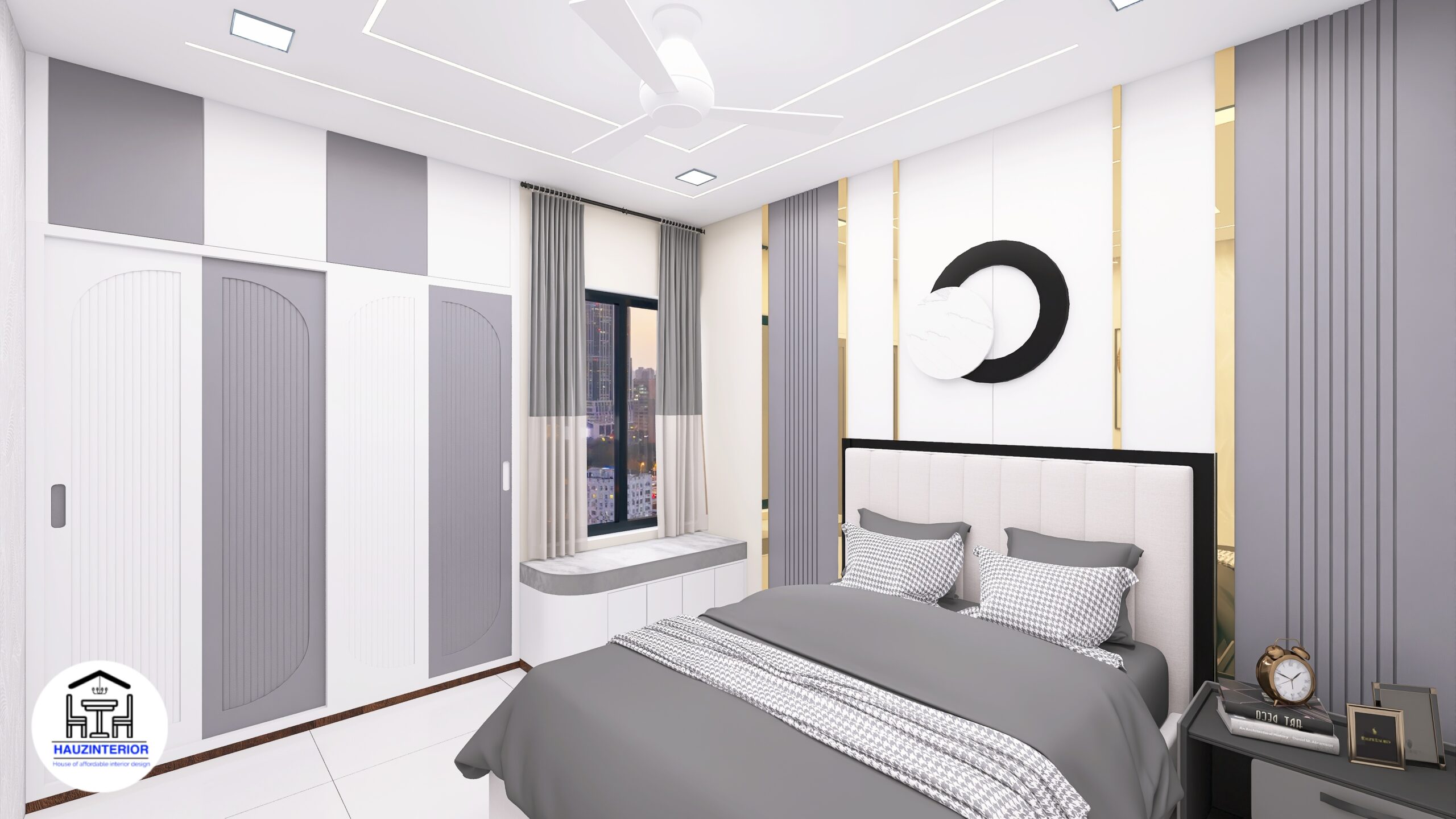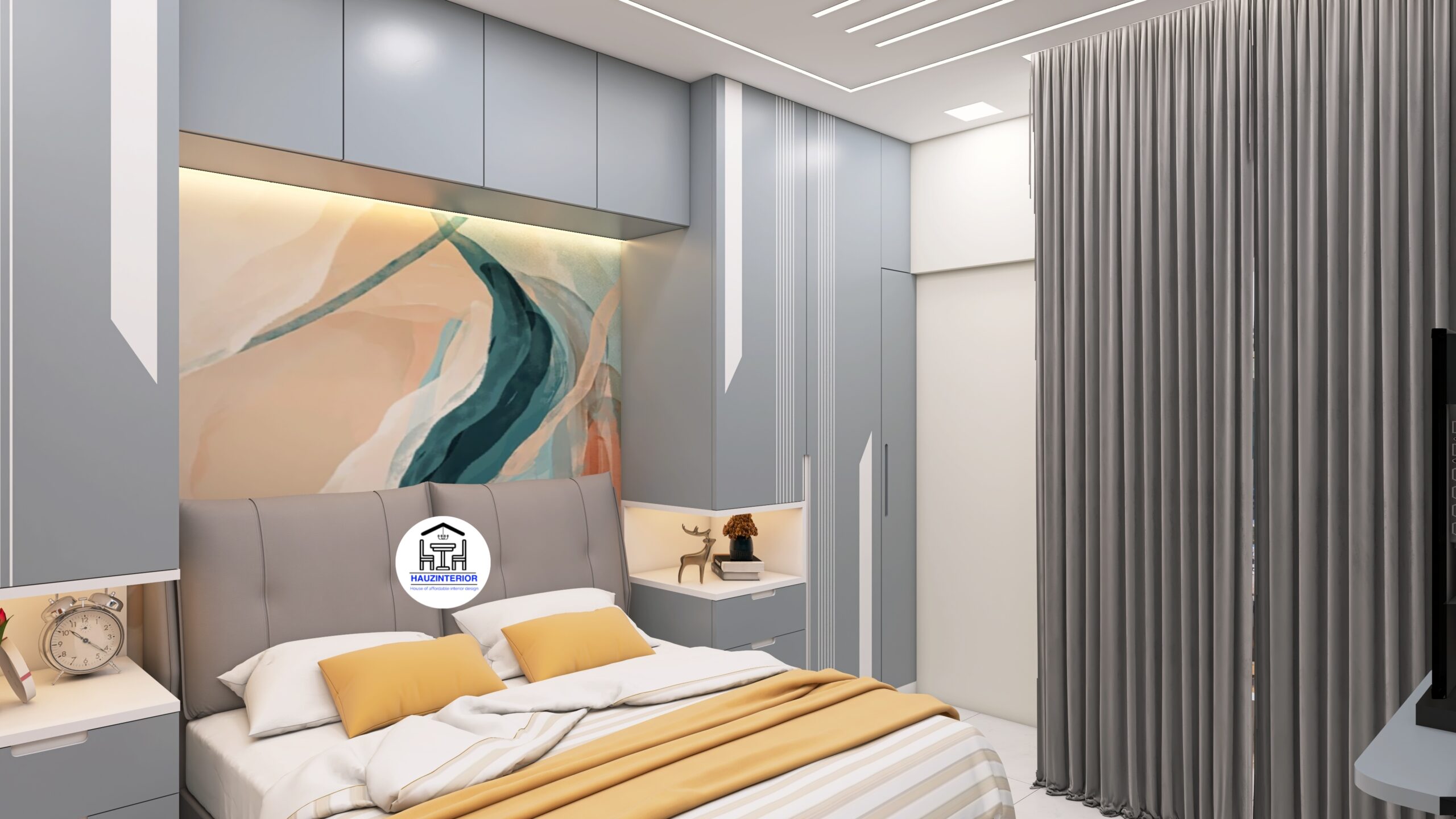 This tranquil bedroom by Hauz Interior showcases a calming earthy palette, arched wall art with ambient backlighting, sleek modular wardrobes, and elegant mandala detailing—offering a perfect blend of style and serenity. Watch full project via 3D Walkthrough link.